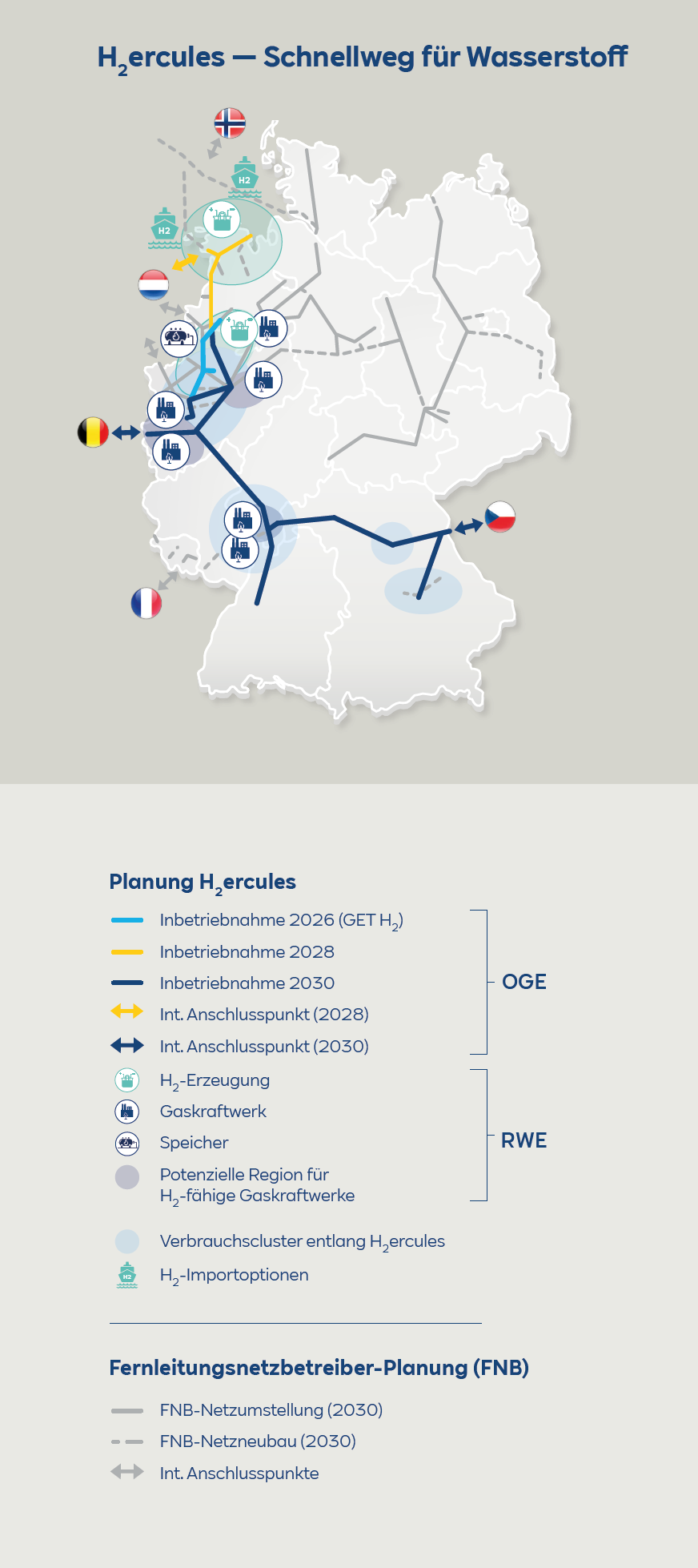 Über die bislang geplanten Kapazitäten können aber auch weitere Wasserstoffanbieter entlang des H2ercules-Netzes sowie des Weiteren Kernnetzes angeschlossen werden. Die Schwerpunkte werden dabei im Norden Deutschlands liegen.