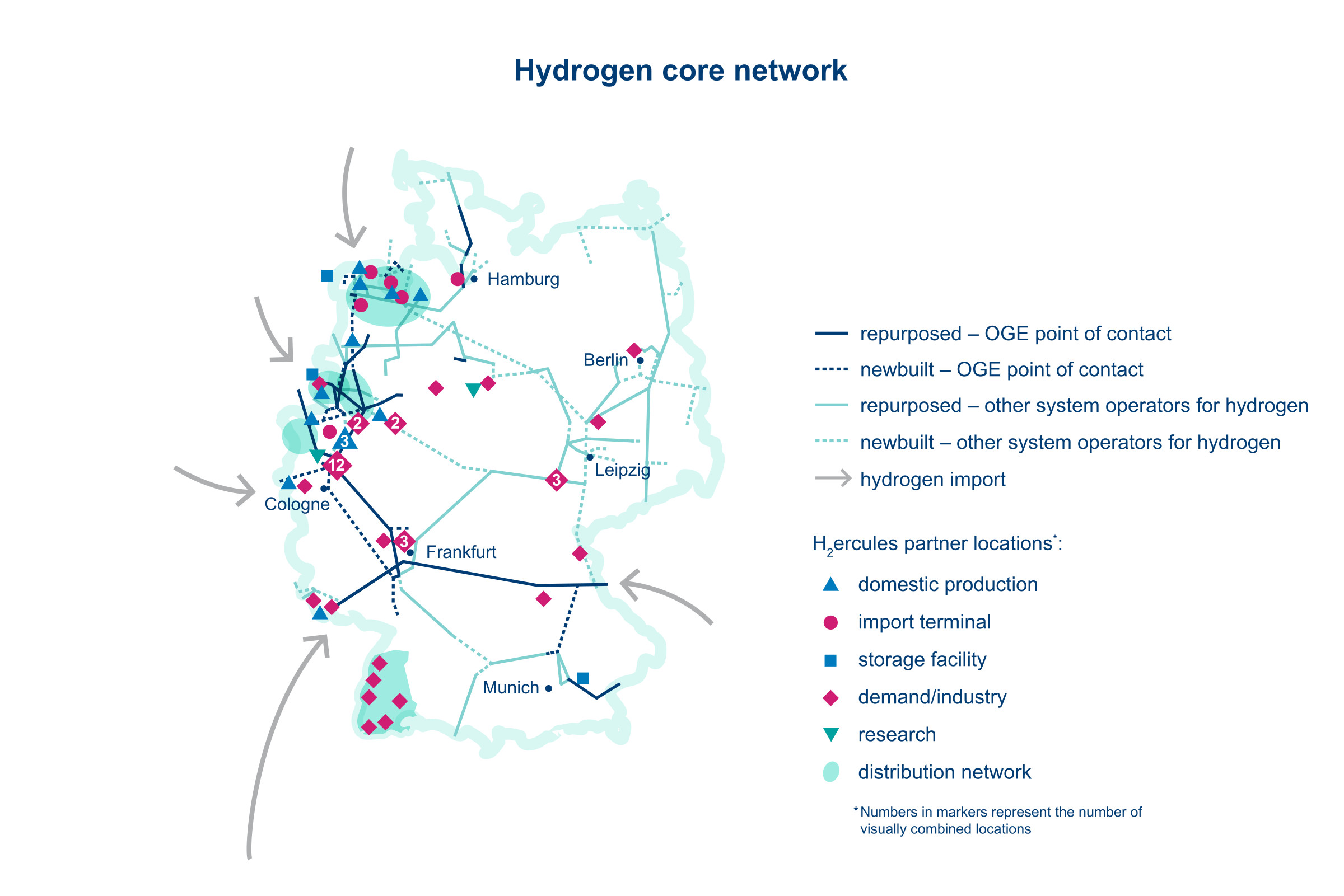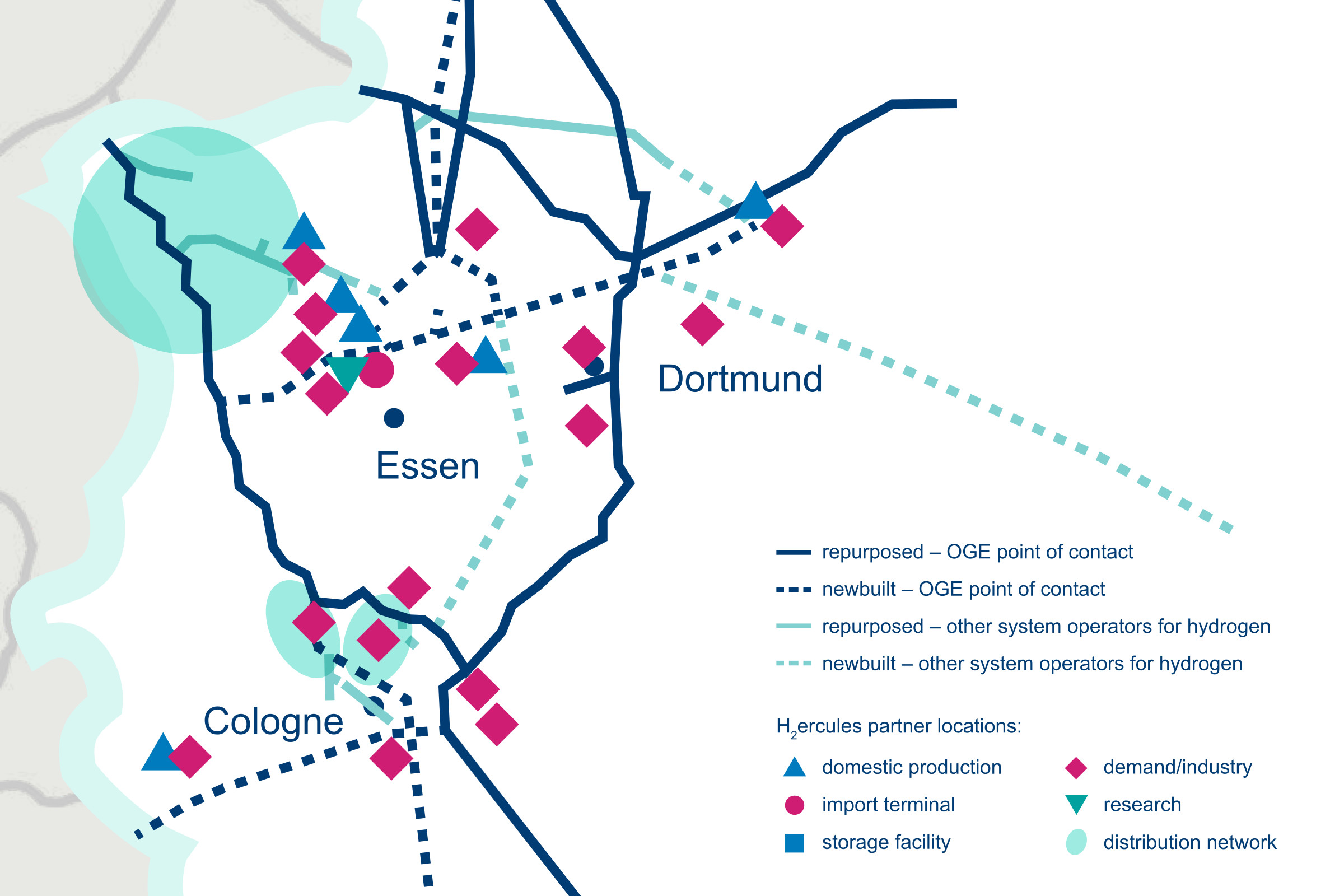 Since German hydrogen production cannot meet the expected demand, additional hydrogen must be transported to Germany via import corridors and fed into the German hydrogen network. As part of the H2ercules initiative, the partners have already planned corresponding import points.